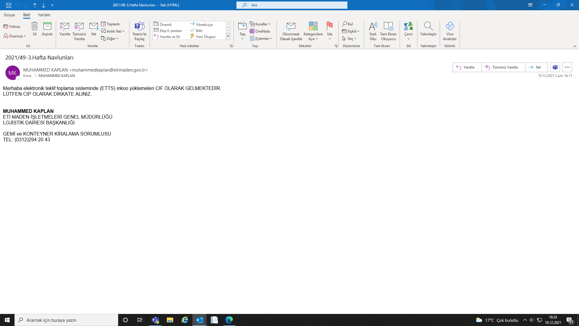 ETİ MADEN 2021/49-3.Hafta Navlunları